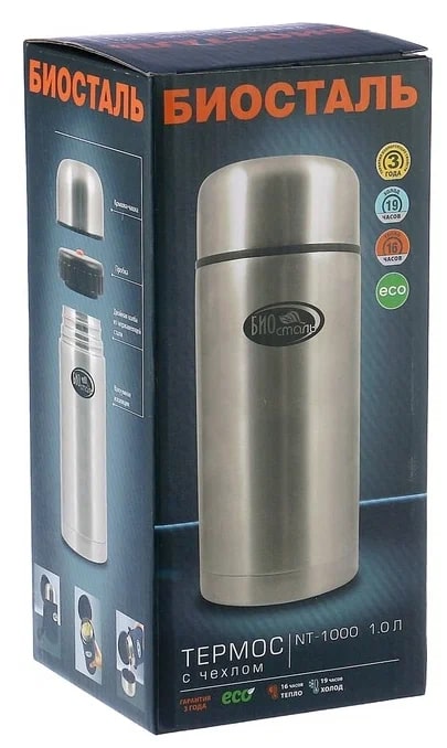 Пищевой термос с широким горлом NТ-1000 БИОСТАЛЬ относится к классической серии. Термосы этой серии, являющейся лидером продаж, экономичны, просты в использовании и продается в удобном чехле. Термосы с широким горлом предназначены для хранения горячей пищи (преимущественно вторых блюд), холодной пищи (замороженных продуктов, мороженного и пр.), фруктов и льда. Пробка, обладая дополнительной теплоизоляцией, позволяет термосу дольше хранить тепло и снабжена клапаном, облегчающим его открытие.